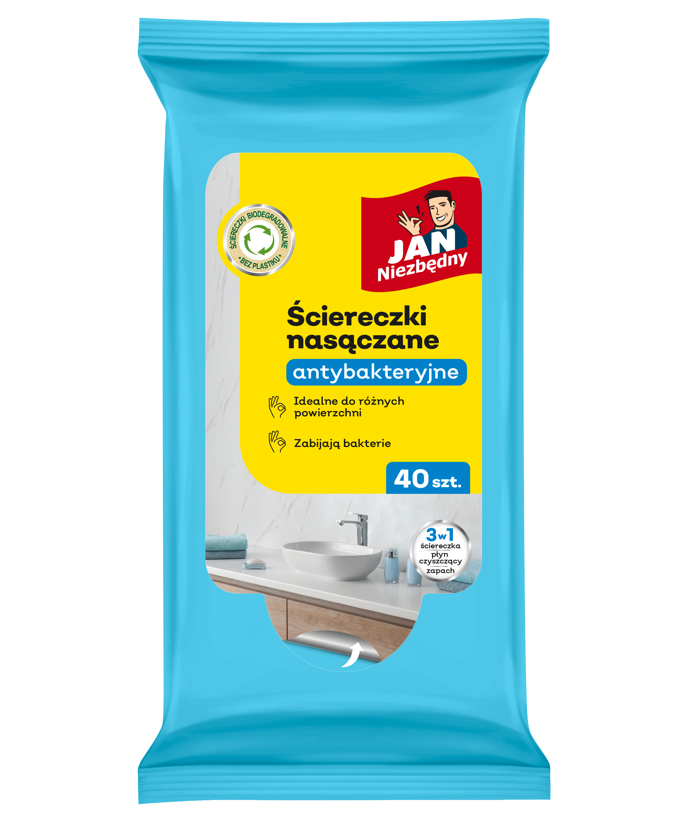 Ściereczki Jan Niezbędny to produkt 3 w 1. Otrzymujesz ściereczkę, płyn czyszczący i kompozycję zapachową w jednym. Ten produkt pomoże Ci łatwo pozbyć się zabrudzeń z każdej powierzchni i w dowolnym momencie, ale dodatkowo zdezynfekuje ją, zabijając bakterie w każdej czyszczonej przez Ciebie części domu – salonie, kuchni i łazience – bez użycia dodatkowych detergentów.