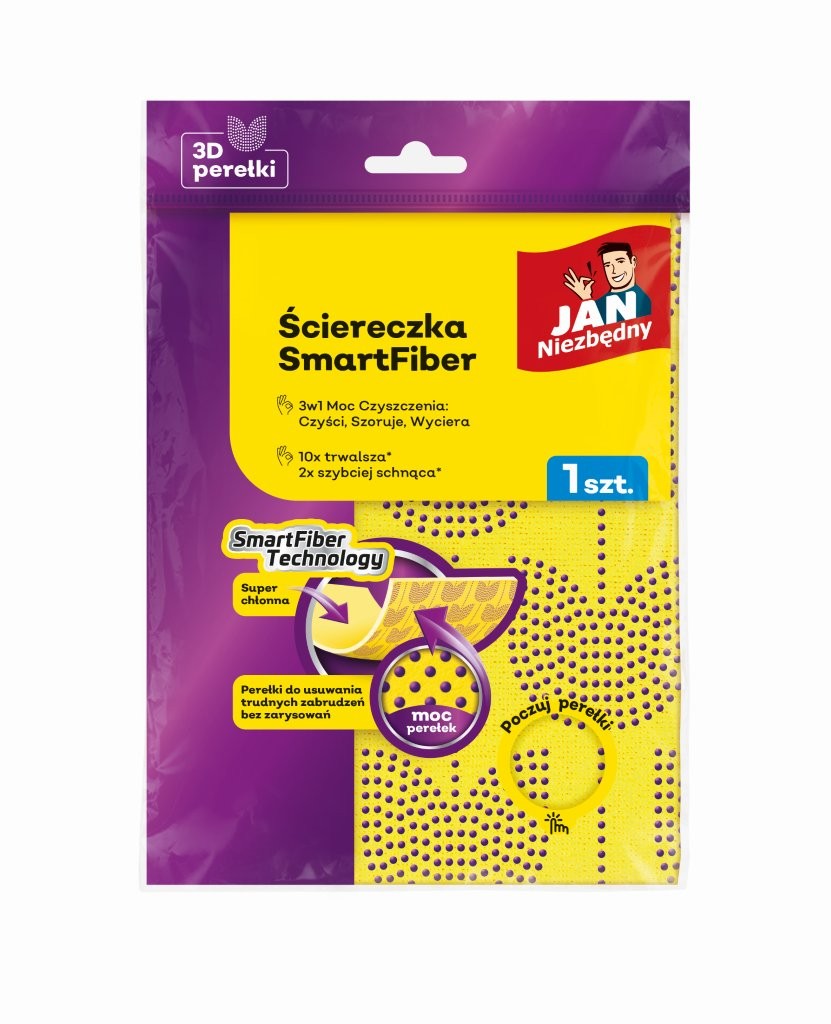 Ściereczka z mikrofibry SmartFiber to nowy wymiar sprzątania! Unikalna ściereczka 3w1 z technologią SmartFiber 3D, która łączy maksymalną chłonność z wyjątkową skutecznością czyszczenia oraz trwałością samej ściereczki. Dzięki dwustronnej strukturze zapewnia doskonałe efekty: jedna strona błyskawicznie myje i wyciera, a druga - wyposażona w perełki 3D - skutecznie usuwa uporczywe zabrudzenia i smugi wodne, nie rysując powierzchni.